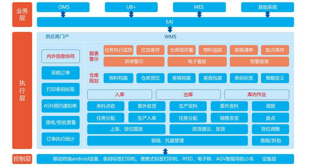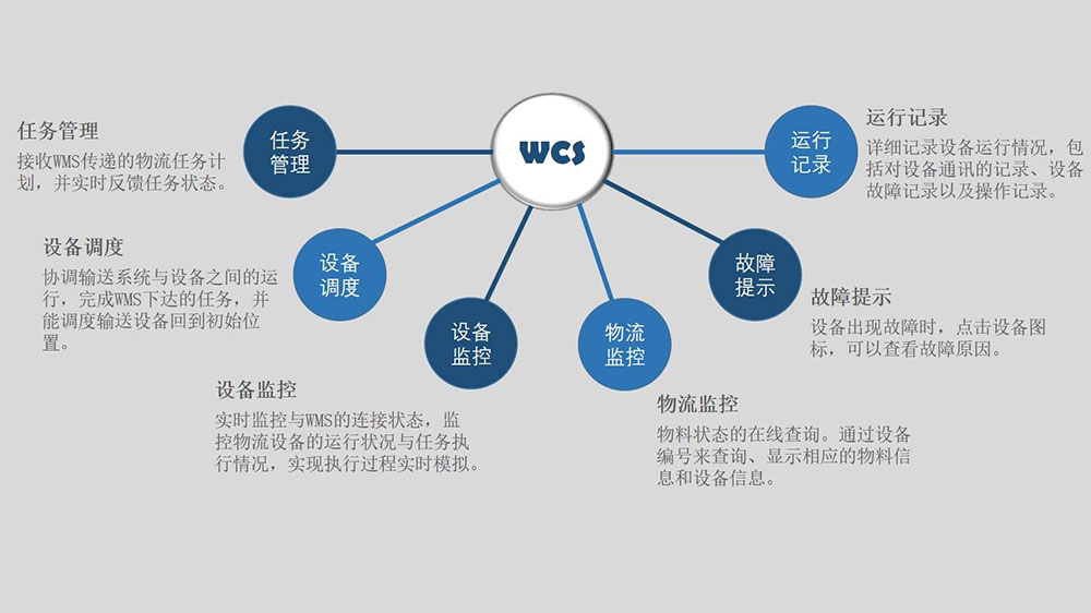 對接倉庫管理系統(tǒng)(WMS),集成各種設(shè)備數(shù)據(jù),監(jiān)控和統(tǒng)一調(diào)度堆垛機(jī)、機(jī)器人、AGV系統(tǒng)等底層物流設(shè)備,高效執(zhí)行規(guī)劃好的業(yè)務(wù)流程。