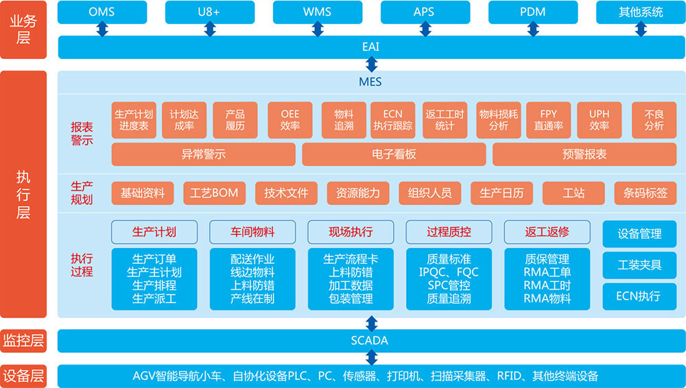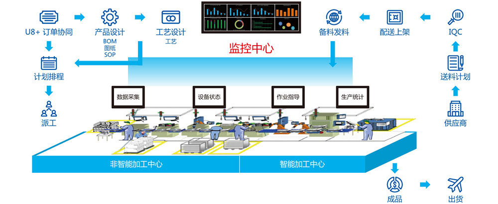 | 兼容主流的 CNC、PLC、各種智能終端 | 圍繞生產(chǎn)核心,采集、傳輸、存儲、管理工業(yè)大數(shù)據(jù) | 以MES系統(tǒng)為核心,實(shí)現(xiàn)智能排產(chǎn),提高人員、設(shè)備、倉儲效率 |